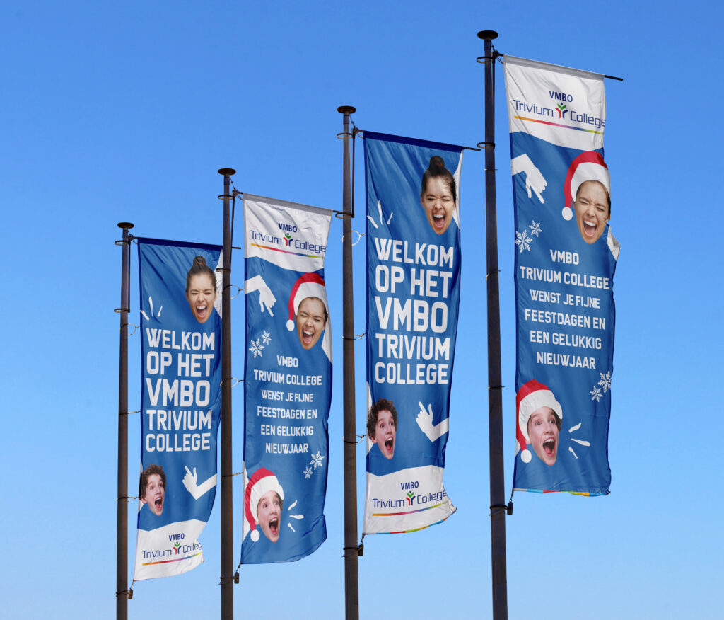Opdracht: Tijdens mijn stage bij Muntz heb ik voor het Trivium College een aantal opdrachten mogen ontwerpen. Ik heb vlaggen ontworpen voor rondom de school, een uitnodigingskaart en een bedrukking voor op de tasjes.